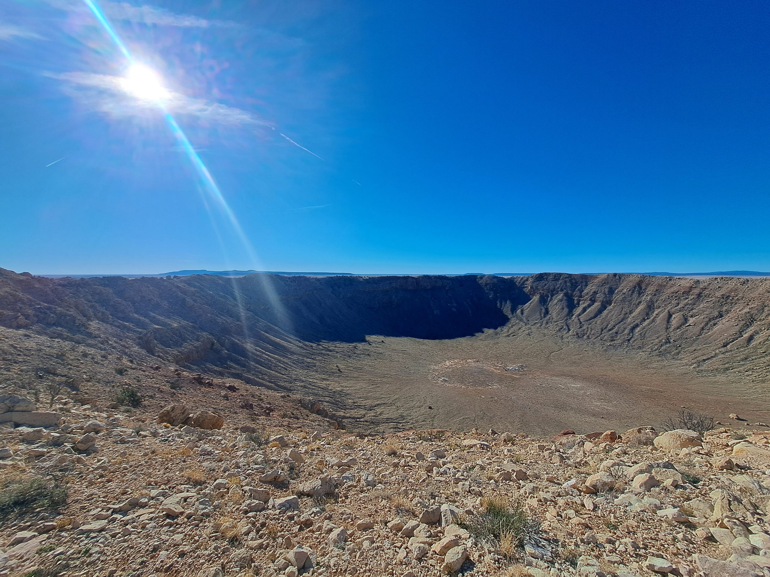 The first event I knew for certain I wanted on this trip was the meteor crater full rim tour, partly because we had to skip it on the family vacation. It was foggy then and we didn’t go at all. Today was clear and sunny. My legs have been increasingly sore the last few days five mile hikes up mountains, especially my ankles. But this was only 2.3 miles on comparatively flat terrain, so I wore my thick socks for extra support and stepped carefully to avoid stressing my ankles.