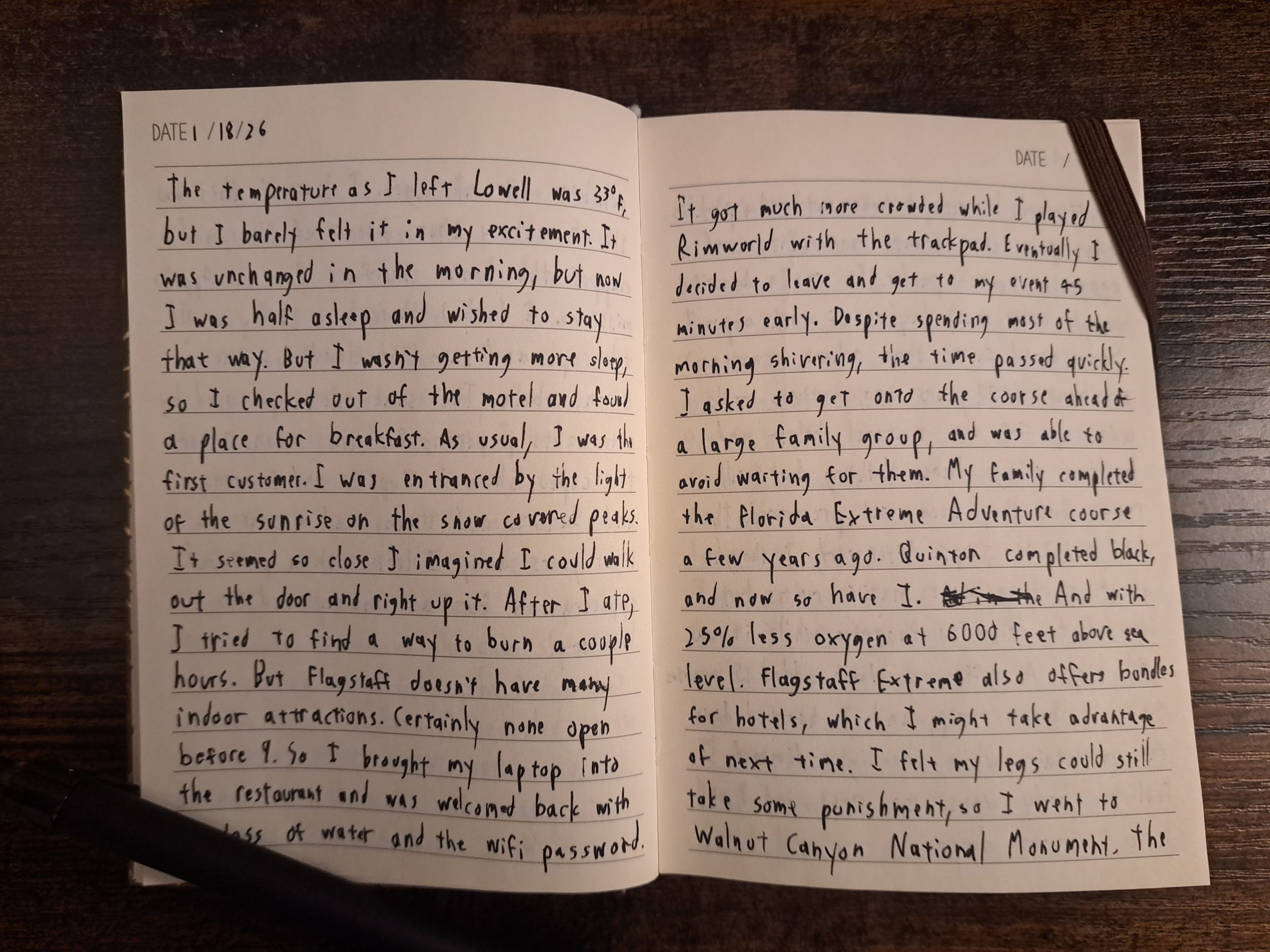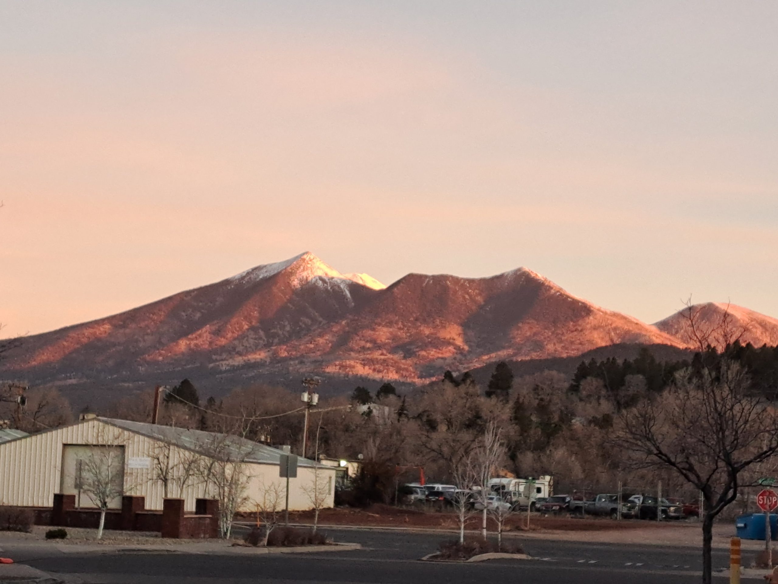 The temperature as I left Lowell was 33 degrees Fahrenheit, but I barely felt it in my excitement. It was unchanged in the morning, but now I was half asleep and shivering. I wasn’t getting more sleep, so I checked out of the hotel and found a place for breakfast. As usual, I was the first customer. I was entranced by the light of the sunrise on the snow covered peaks. It seemed so close I imagined I could walk out the door and right up it. After I ate, I tried to find a way to burn a couple hours until my next event. But Flagstaff doesn’t have many indoor attractions. Certainly none open before nine. So I brought my laptop into the restaurant and was welcomed back with a glass of water and the wifi password.